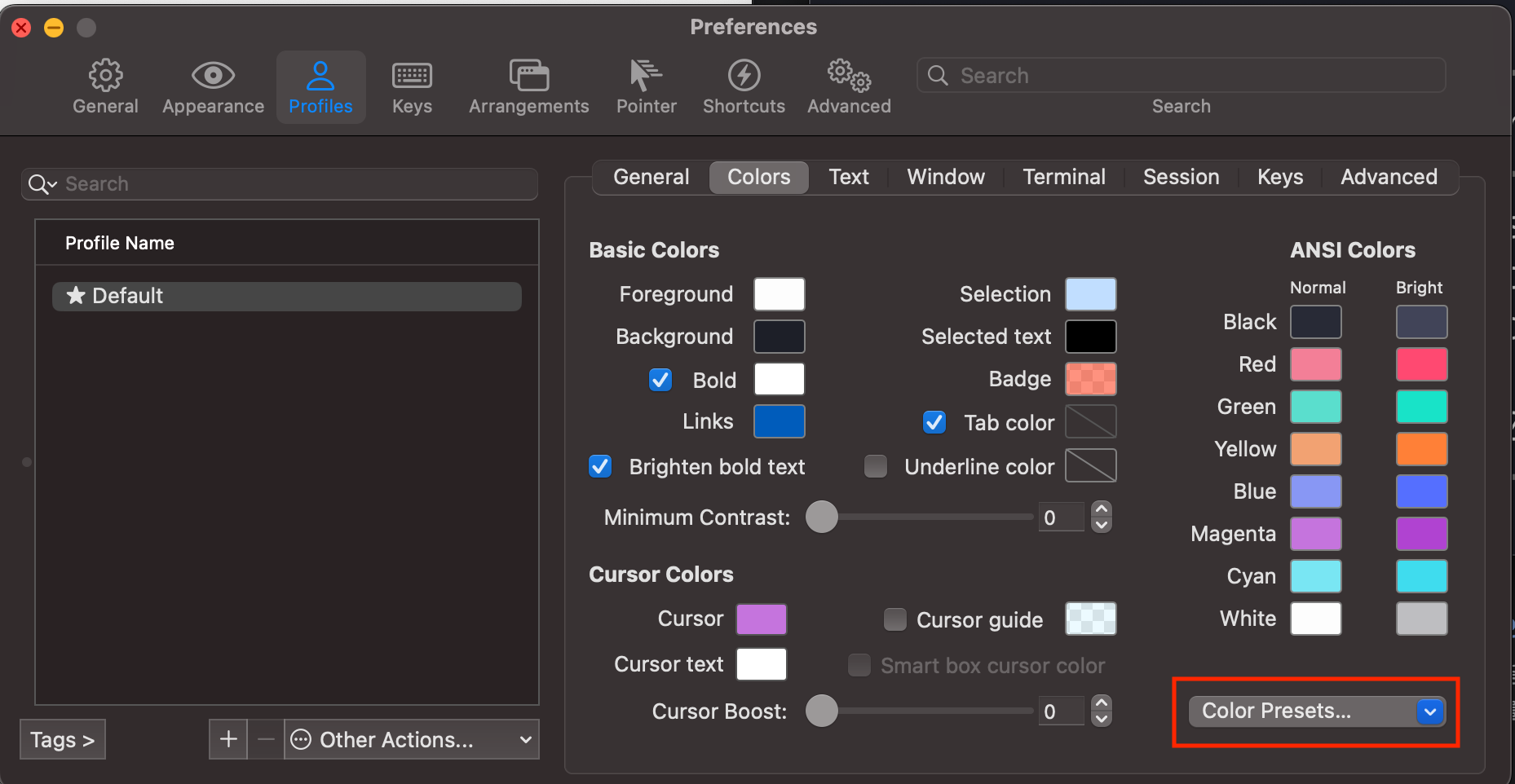 cmd + comma(,) 조합으로 settings에 들어가 Profiles > Colors에 들어가 Color Presets를 클릭한다.